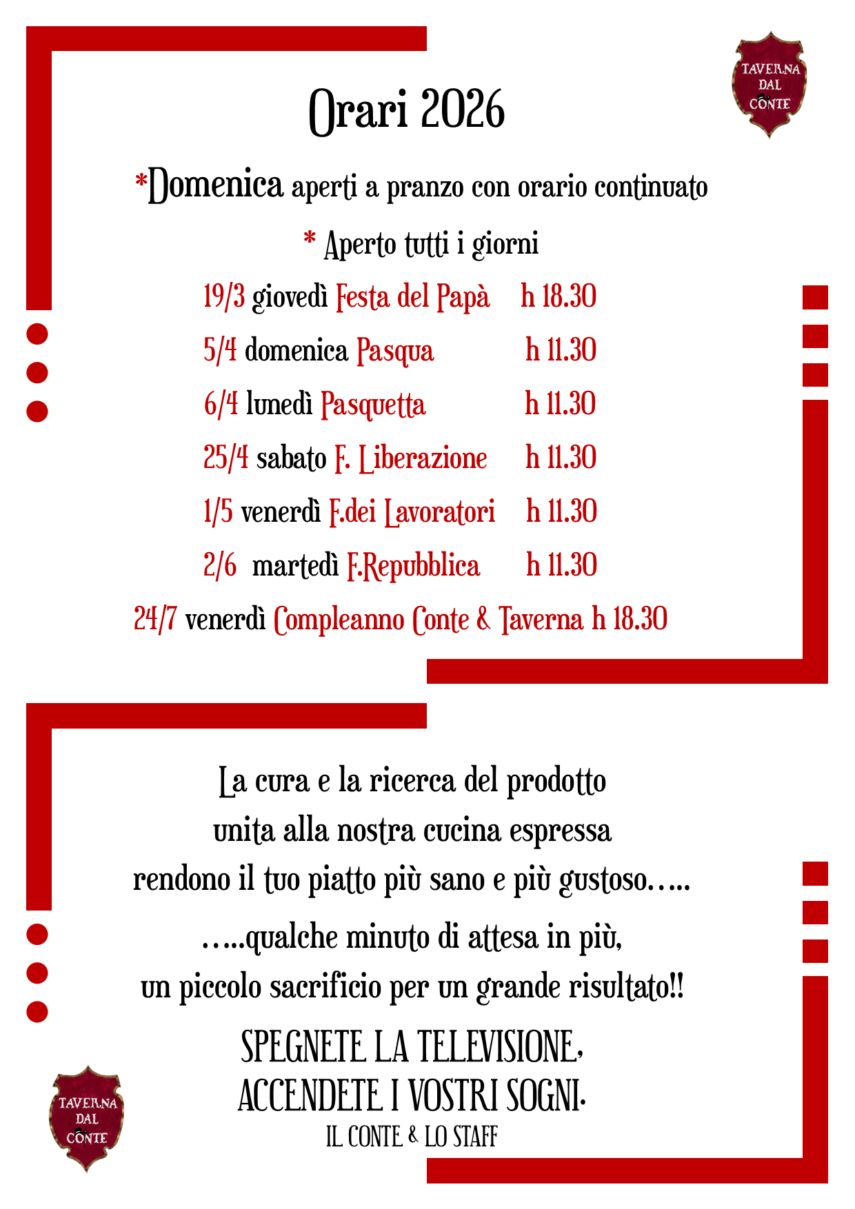 Contattaci via email (tavernaconte@gmail.com), su Messenger (Taverna dal Conte) o su Whatsapp (3295412945).
